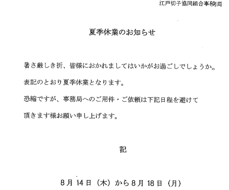 江戸切子協同組合事務所を夏休み8/14-18で頂きます。