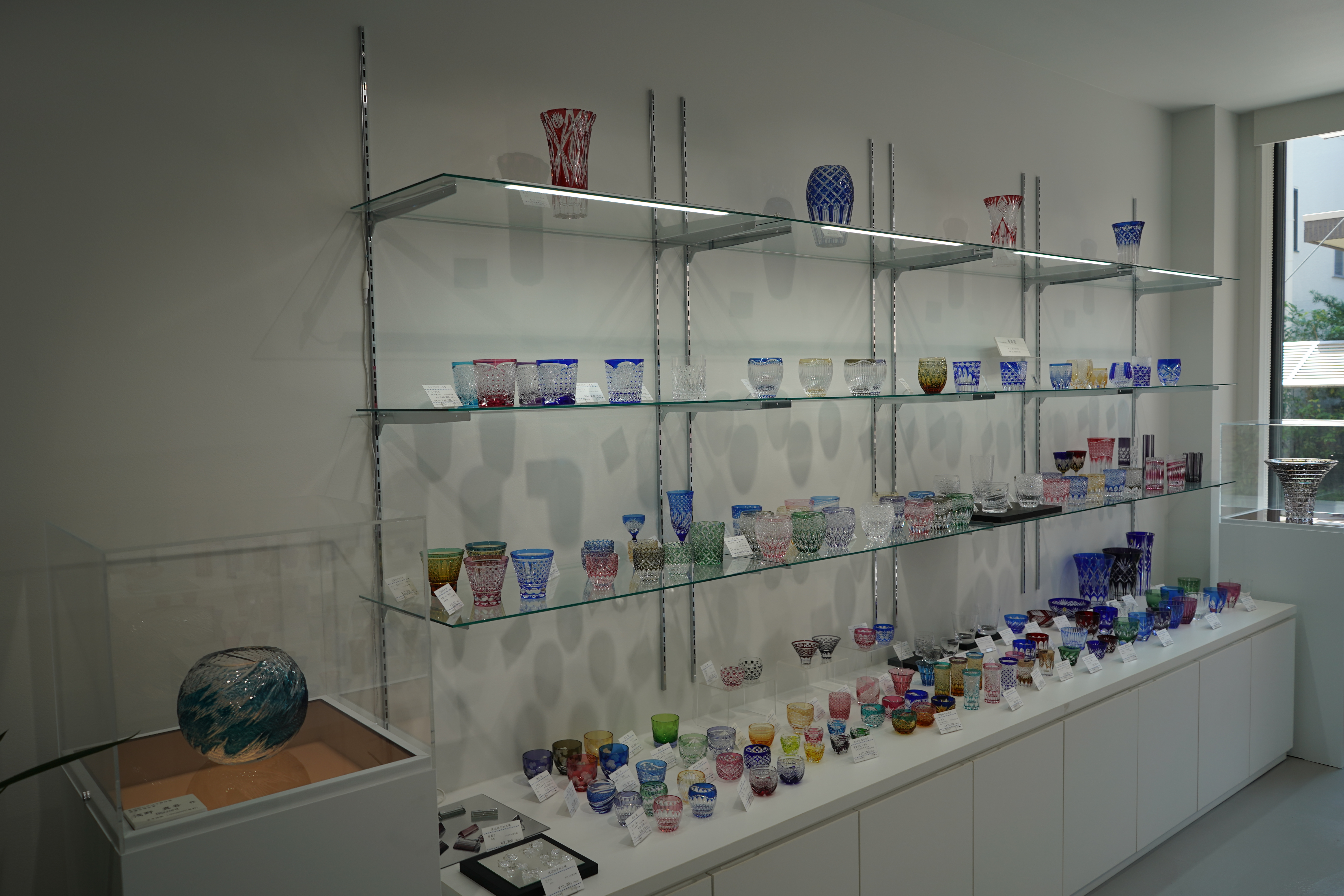 より詳しい江戸切子ショールーム店内の販売・展示風景はこちら。